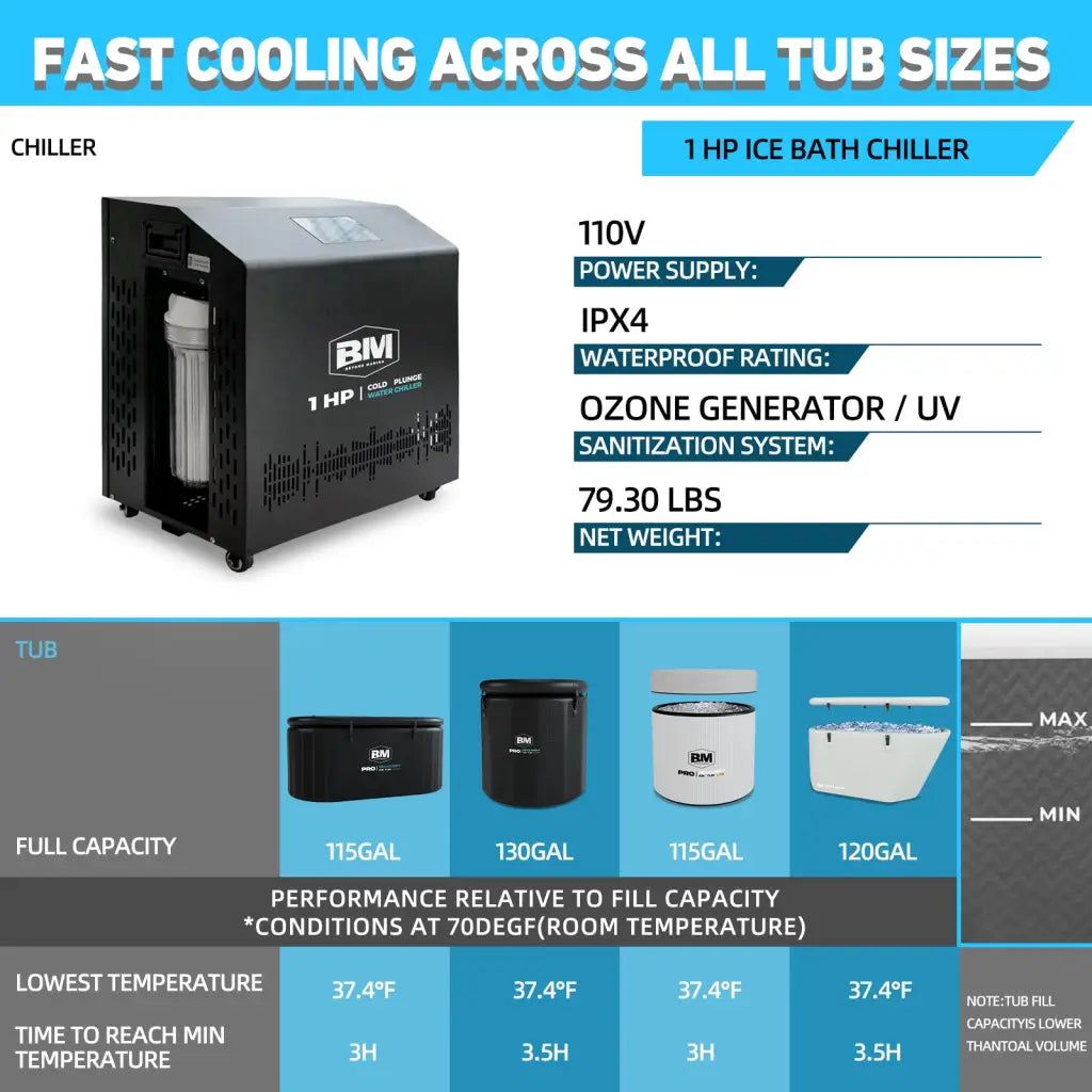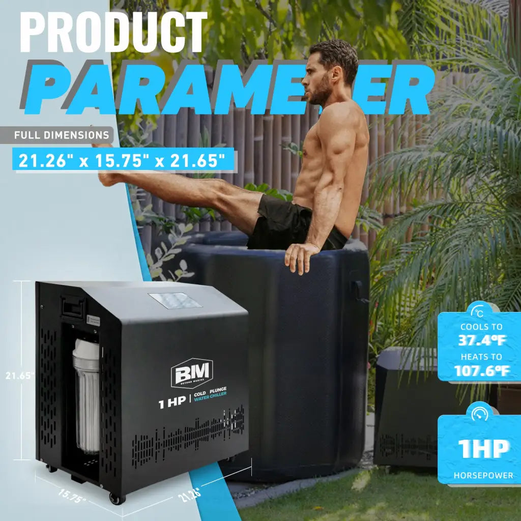 - Perfect for Fitness Recovery: Whether you're a professional athlete or just a fitness enthusiast, this recovery chiller is ideal for promoting muscle recovery, reducing inflammation, and enhancing circulation. The chiller for ice bath functionality can cool 53 gallons of water from 73.4°F to 41°F in just 2.7 hours or 106 gallons in under 5.8 hours, providing a fast and efficient recovery experience