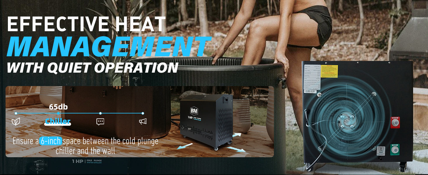 - Noise Reduction for Quiet Operation: The ice bath water chiller operates quietly, with a noise level of <65dB. This low noise output ensures that your cold plunge with chiller operates in a peaceful environment, so you can focus on your recovery without the disturbance of loud machinery. Whether you’re using it indoors or in a more tranquil outdoor setting, the chiller runs quietly to provide a comfortable atmosphere during your cold plunge