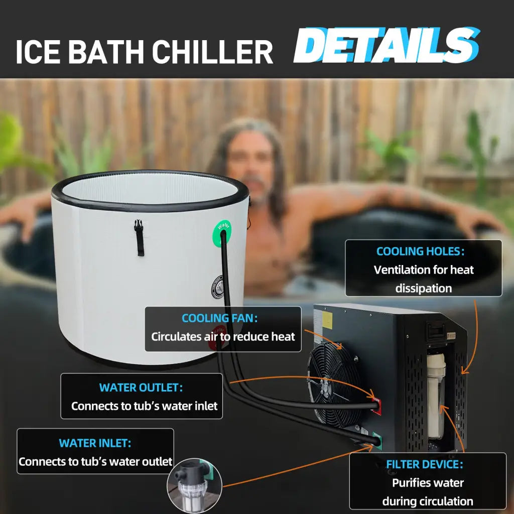 - Dual‑Mode Cooling & Heating Performance: Equipped with a powerful 1HP chiller, this ice bath tub offers versatile temperature control, delivering 2405W of cooling power and 3600W of heating capacity. It can chill 53 gallons of water down to 41°F in under 2.7 hours or warm up the water to a comfortable 108°F, making it suitable for various recovery needs. The system features 1/2” NPT inlet and outlet ports along with BM’s anti-rotation fittings, ensuring secure and stable connections during operation. Whether you need to cool down quickly or warm up for comfort, this ice bath tub provides reliable performance to support your wellness routine.