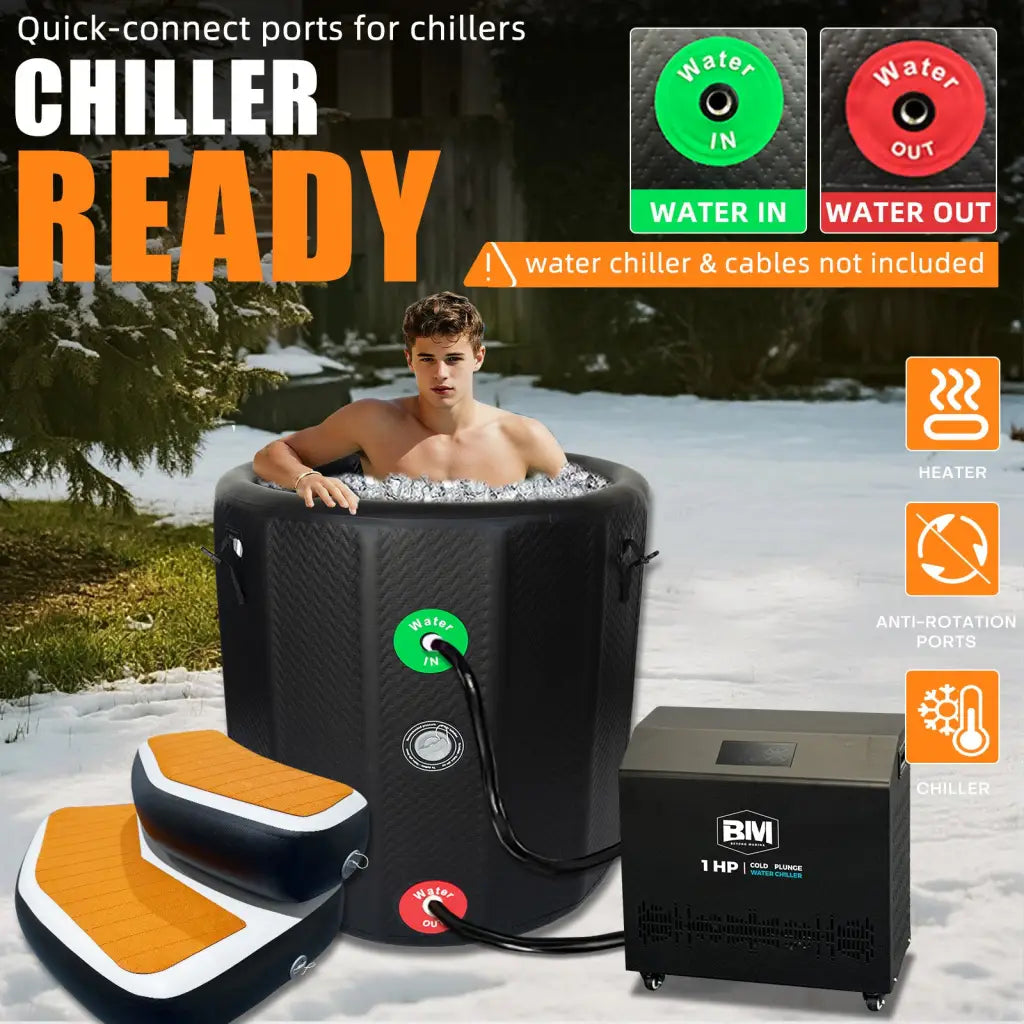 - Chiller-Ready & Leak-Proof: Designed with ½” NPT ports featuring BM’s proprietary anti-rotation technology, this inflatable ice bath allows secure and straightforward connections to water chillers for precise temperature control. The high-quality fittings are rigorously tested to prevent leaks, ensuring a hassle-free setup and consistent performance. This reliable connection system supports long-term use, making your cold plunge experience seamless and maintenance-free.