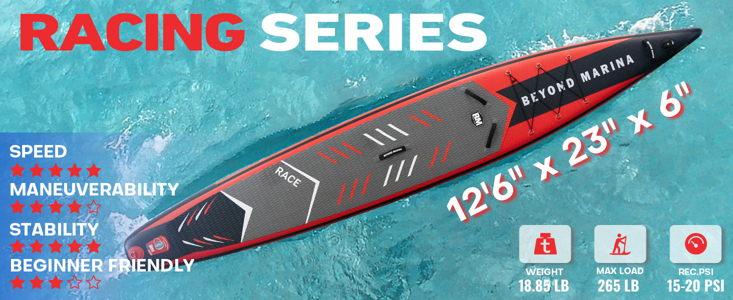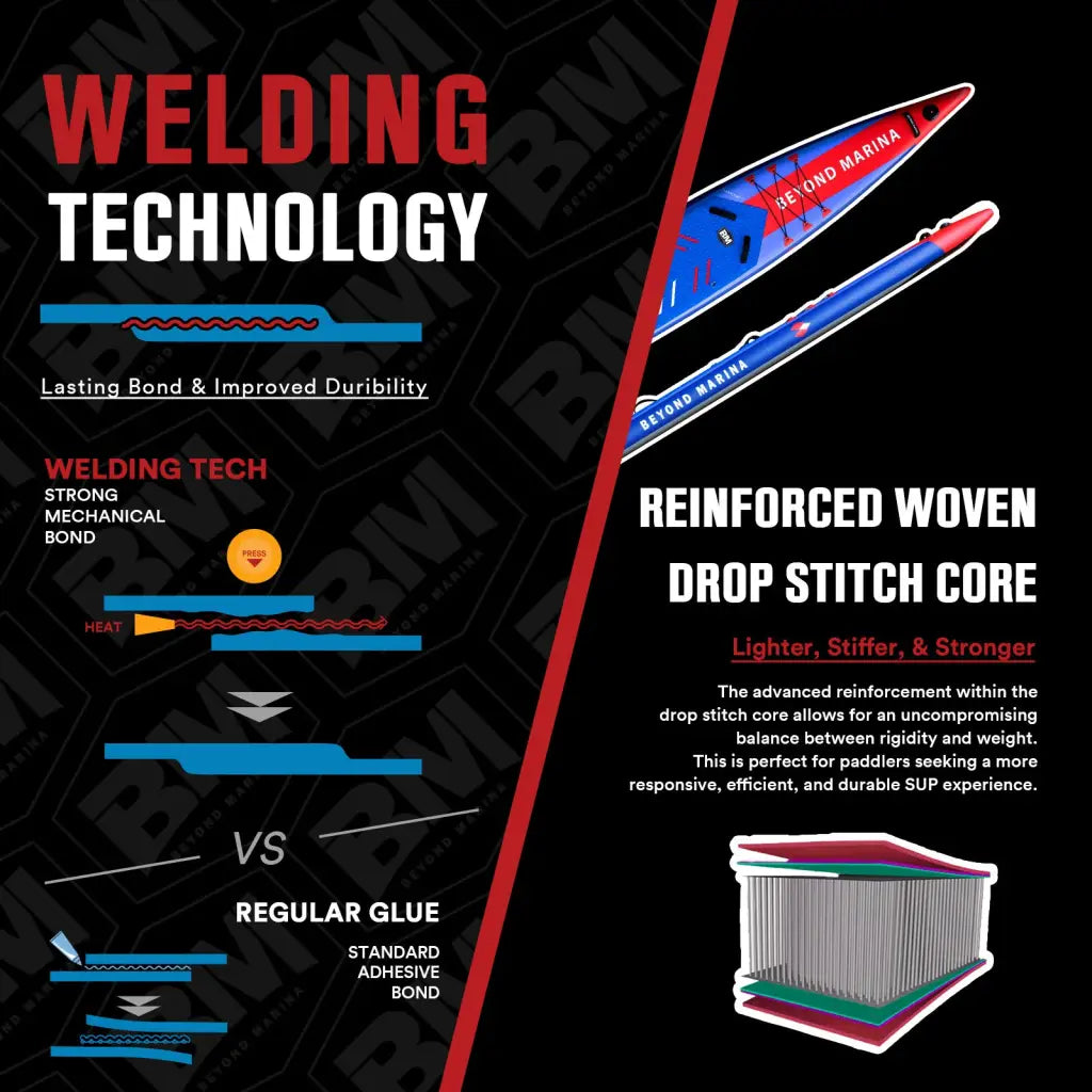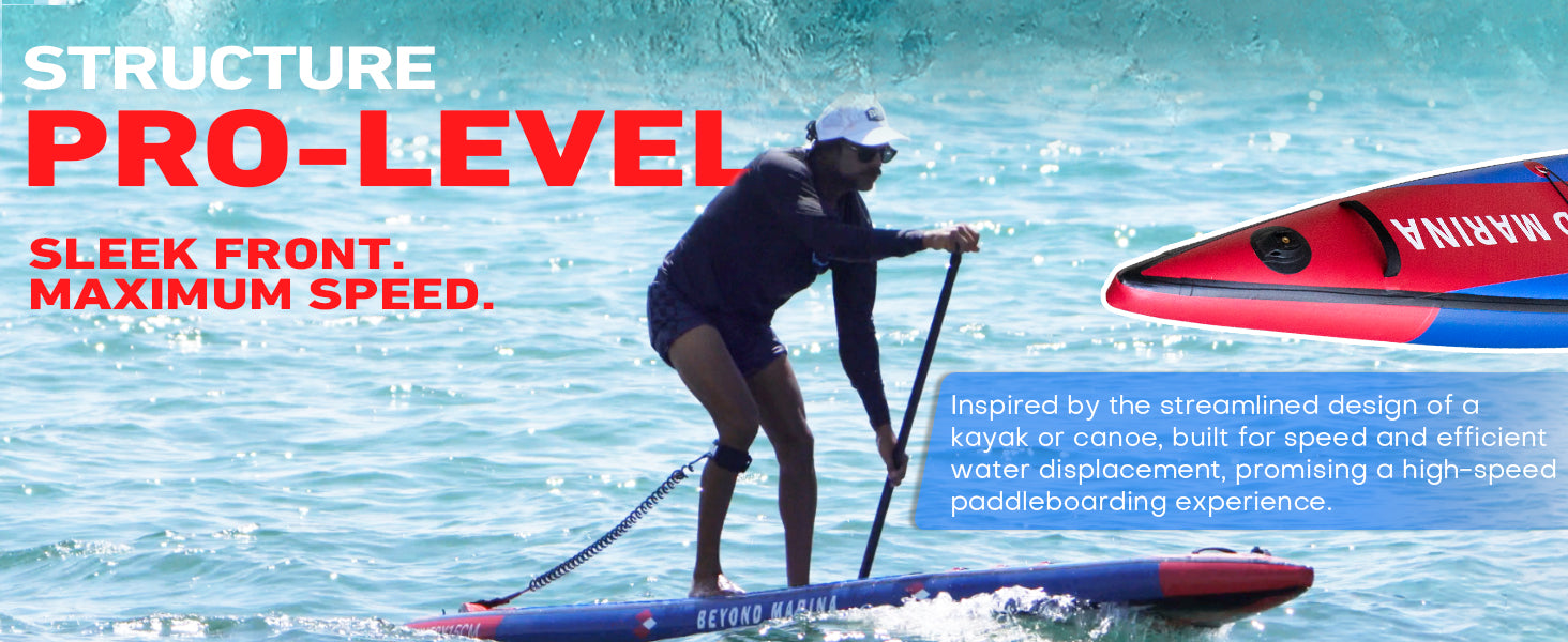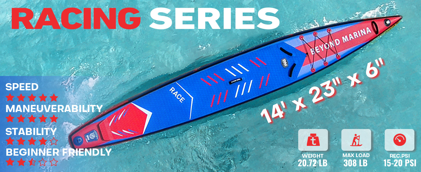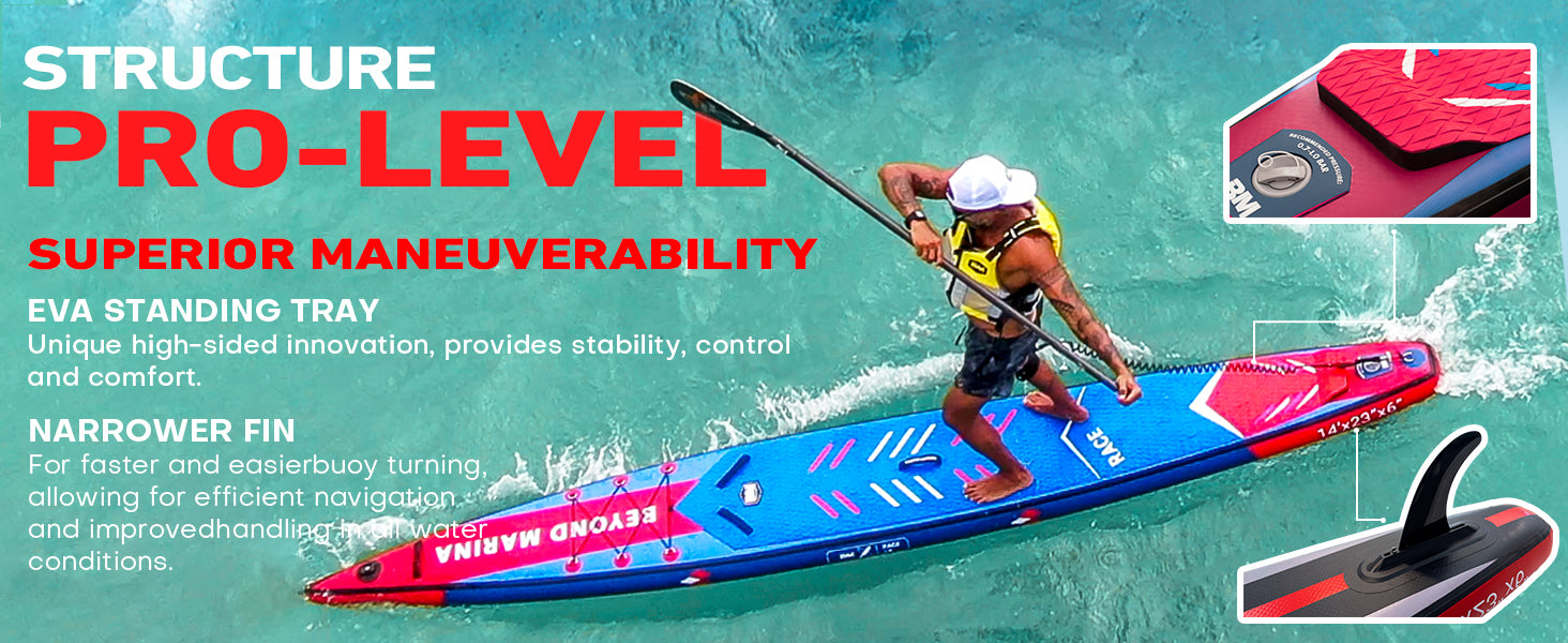 Introducing the Beyond Marina RACE PRO 14 ft inflatable SUP, designed for competitive speed and enduring performance. Built with a dual-core structure and reinforced by Wielding Tech rail bands, this board offers unmatched rigidity and resilience. Constructed using RDS double-layer PVC and woven ultra-light material, it combines durability with a featherlight feel, making it easy to transport while standing up to intense use. The elongated 14 ft frame and tapered tail enhance glide and maneuverability, slicing through water with precision. Race handles ensure secure beach starts, while the EVA standing tray and diamond-textured deck deliver exceptional grip, stability, and comfort during long sessions. An FCS insert lets you mount a GoPro or phone, capturing every race or adventure. Quick to inflate with the included dual-action pump, it packs neatly into a backpack for portability. Perfect for racers or avid paddlers, the RACE PRO leverages innovative design and premium materials to provide a lightweight, robust, and high-speed paddleboarding experience. With its sleek profile and cutting-edge construction, this 14 ft board is your ticket to dominating the water in style and efficiency.