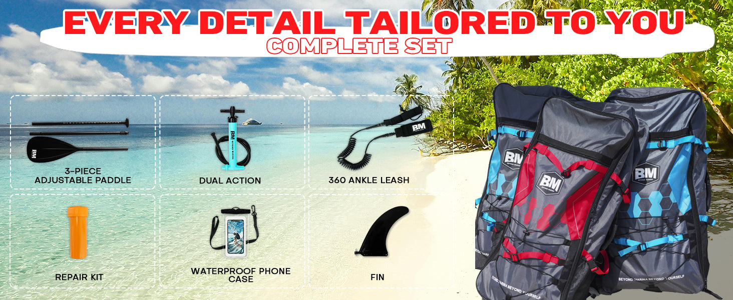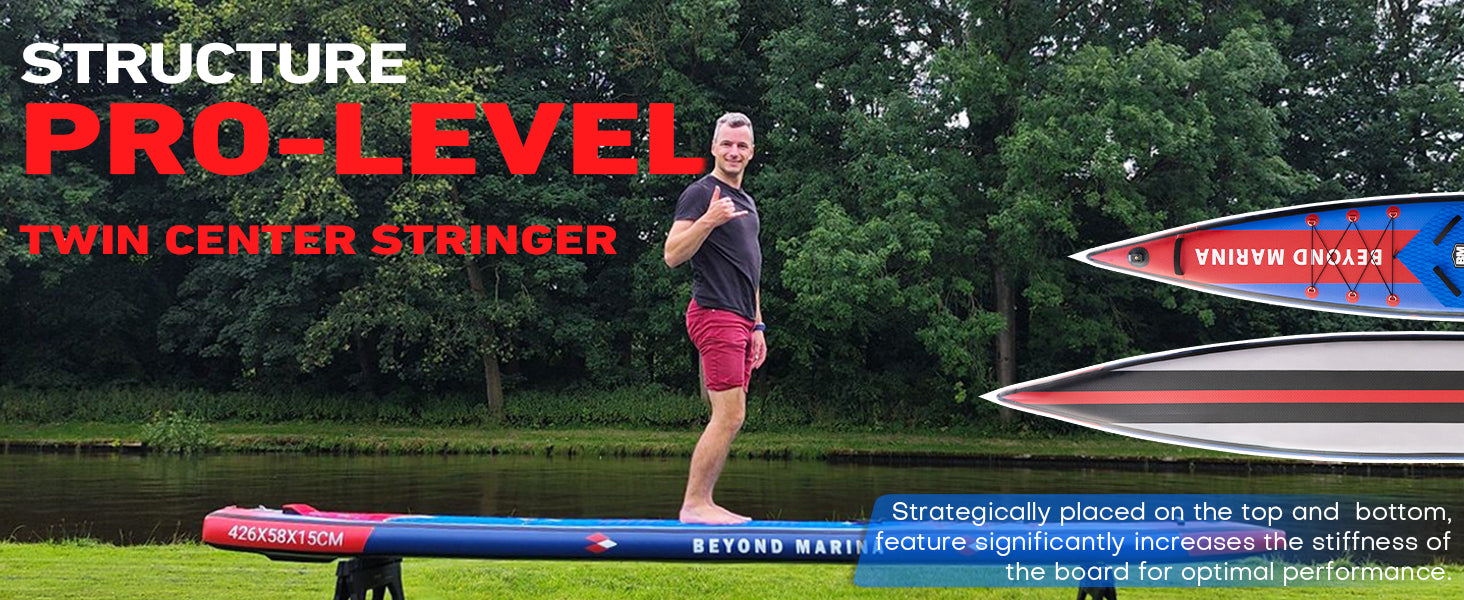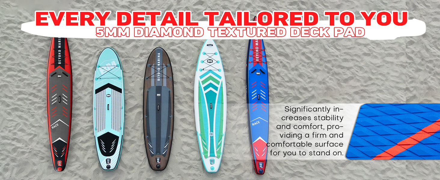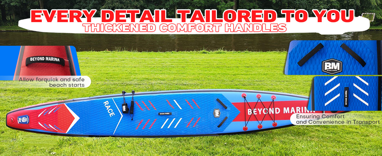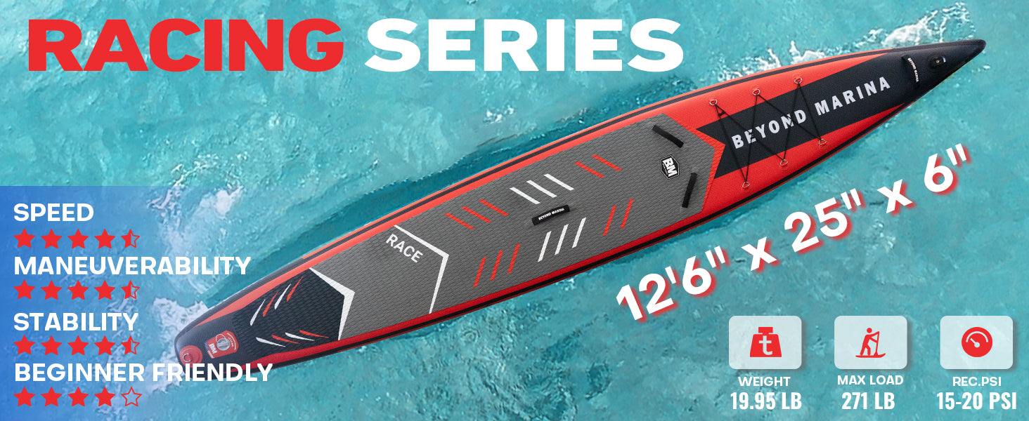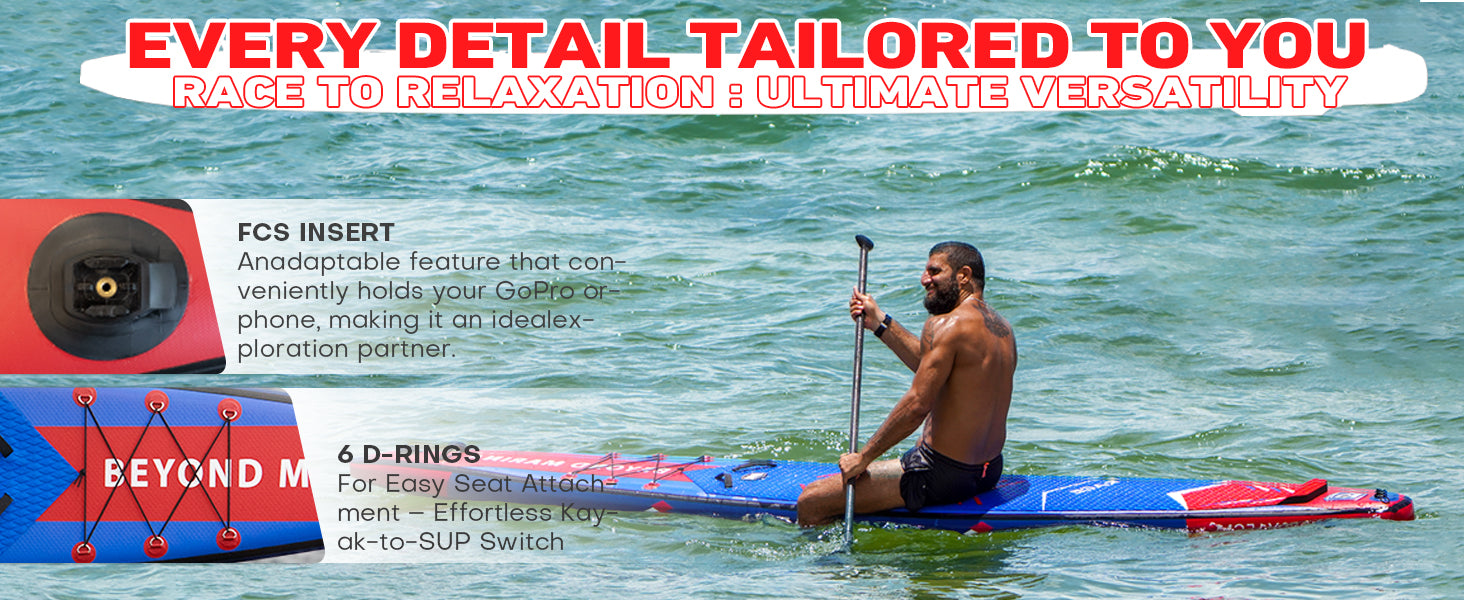 Introducing the Beyond Marina RACE PRO 14 ft inflatable SUP, designed for competitive speed and enduring performance. Built with a dual-core structure and reinforced by Wielding Tech rail bands, this board offers unmatched rigidity and resilience. Constructed using RDS double-layer PVC and woven ultra-light material, it combines durability with a featherlight feel, making it easy to transport while standing up to intense use. The elongated 14 ft frame and tapered tail enhance glide and maneuverability, slicing through water with precision. Race handles ensure secure beach starts, while the EVA standing tray and diamond-textured deck deliver exceptional grip, stability, and comfort during long sessions. An FCS insert lets you mount a GoPro or phone, capturing every race or adventure. Quick to inflate with the included dual-action pump, it packs neatly into a backpack for portability. Perfect for racers or avid paddlers, the RACE PRO leverages innovative design and premium materials to provide a lightweight, robust, and high-speed paddleboarding experience. With its sleek profile and cutting-edge construction, this 14 ft board is your ticket to dominating the water in style and efficiency.