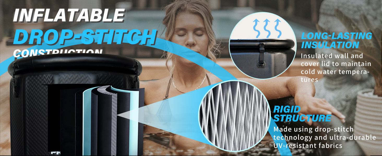 - Fully Insulated to Last Long: Made with military-grade double-layer material, Whether you’re using ice or a chiller, the inflatable dropstitch insulation throughout the tub and thermal lid helps keep your water colder for longer, especially in warm weather; The material is puncture-resistant, leak-proof, and UV-resistant, and it withstands multiple folds without creasing, ensuring durability and long-term performance