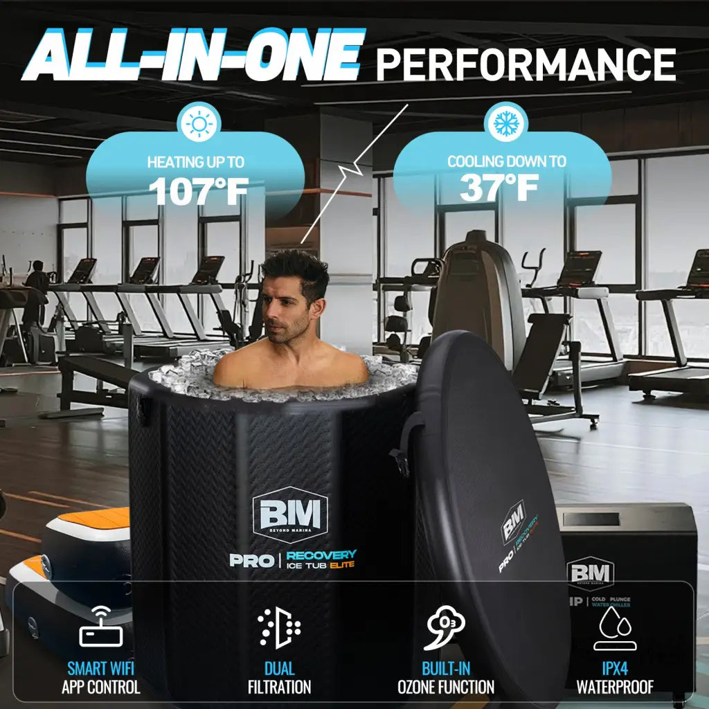 - Powerful Dual-Mode Chiller Performance: Equipped with a robust 1 HP chiller, this system delivers 2405W of cooling power and 3600W of heating capacity. It can chill 53 gallons of water to 41°F in under 2.7 hours or warm the water up to 108°F, providing versatile temperature control for both cold and hot recovery needs. The system features ½” NPT ports and BM’s anti-rotation fittings, ensuring secure, leak-free connections that simplify setup and maintenance, so you can focus on your recovery or wellness routine without technical worries.