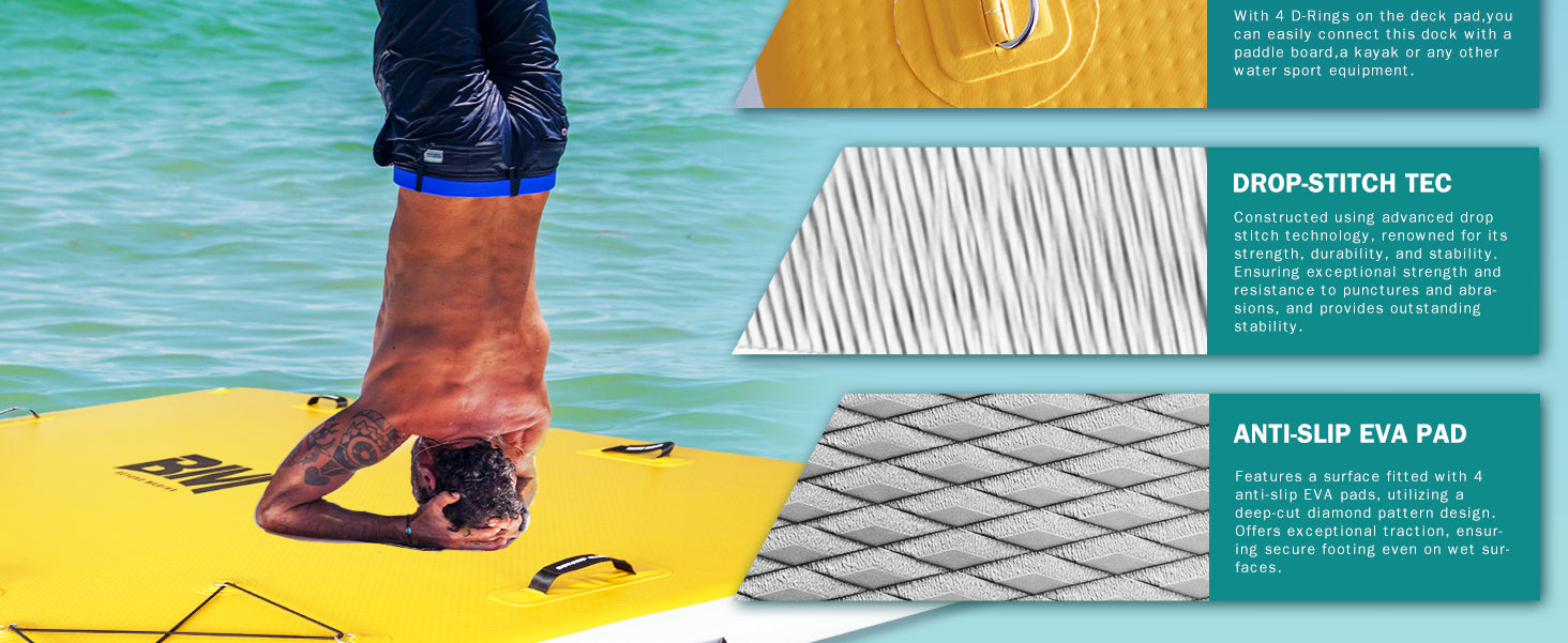 Experience worry-free waterfront fun with the Inflatable Dock! This reliable and stable inflatable dock offers peace of mind and safety with high-strength tubes and non-slip surfaces. Whether you're relaxing, fishing, or docking your boat, the Air Dock is the perfect platform for all your needs. Its easy setup and transport make it the ideal choice for a solid foundation for all your waterfront activities. Trust the Air Dock to provide a stable and secure experience in any conditions.