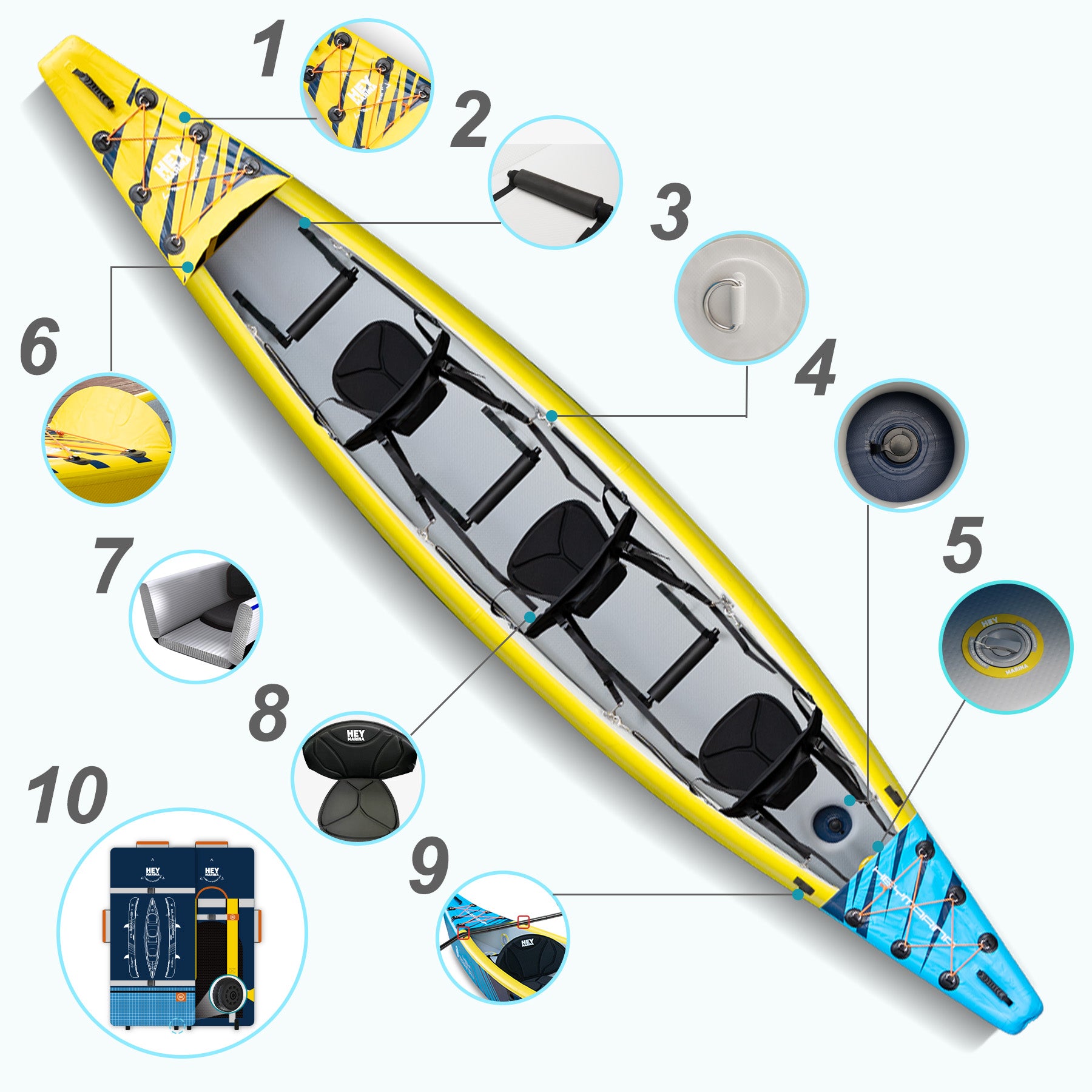 Resembling the rigidity of hard shell kayaks, the triple inflatable kayak features a very strong and durable tri-chamber drop-stitch construction. This unique design enhances the stability and performance of the kayak, giving you a high level of control and precision in your paddling that is not normally expected from an inflatable kayak.