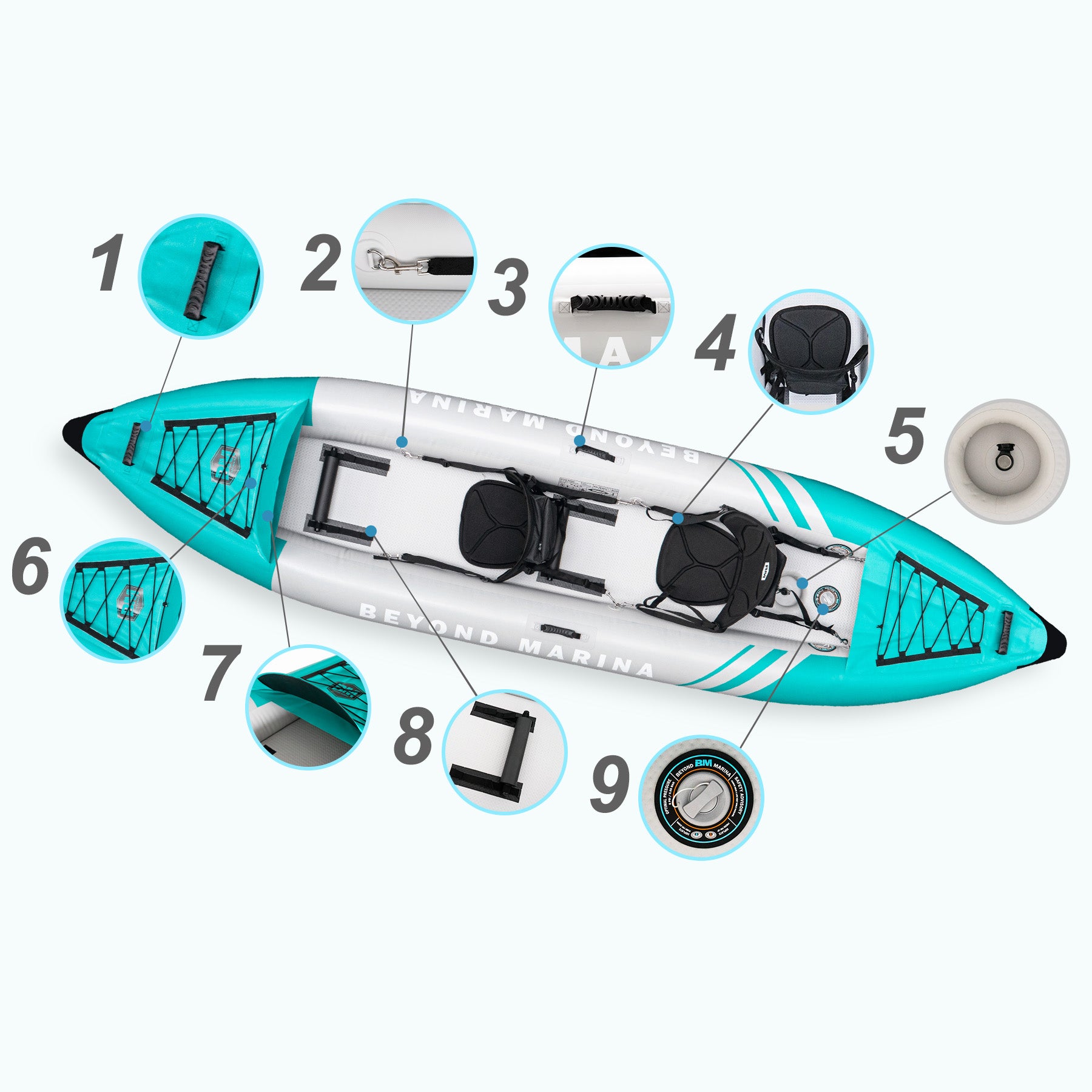 - Portable and Easy to Use: With a high pressure hand pump, the Beyond Marina Inflatable Kayak with Drop Stitch Bottom inflates to a full size kayak in less than 5 minutes, making it perfect for spontaneous adventures. Hull lightweight design at 25.35 lb allows for easy transport and maneuvering.