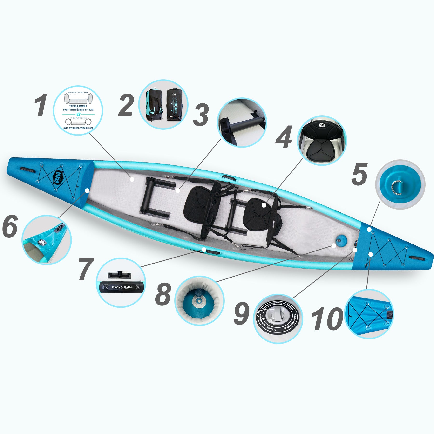 1. Triple-Chamber Drop-Stitch Construction (Sides & Floor) — Ensure maximum safety, comfort, and durability.
