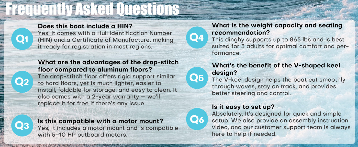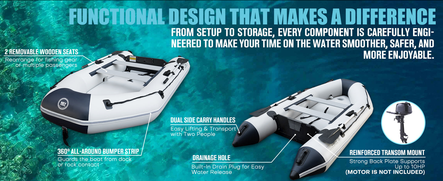 Versatile and Easy to Use: Equipped with all essential accessories, this inflatable boat set simplifies setup so you can get on the water quickly. It includes two durable aluminum oars for efficient paddling, a foot pump for fast inflation, two wooden seats for added comfort, an inflatable drop-stitch floor for stability, a dedicated carrying and storage bag, a repair kit for emergency fixes, and a comprehensive user manual. The setup process typically takes less than 10 minutes, meaning you can spend more time enjoying your outing rather than assembling your watercraft. Its versatility and user-friendly features make it an ideal choice for beginners, families, or seasoned water enthusiasts seeking a reliable inflatable dinghy from the 10ft Heymarina series.