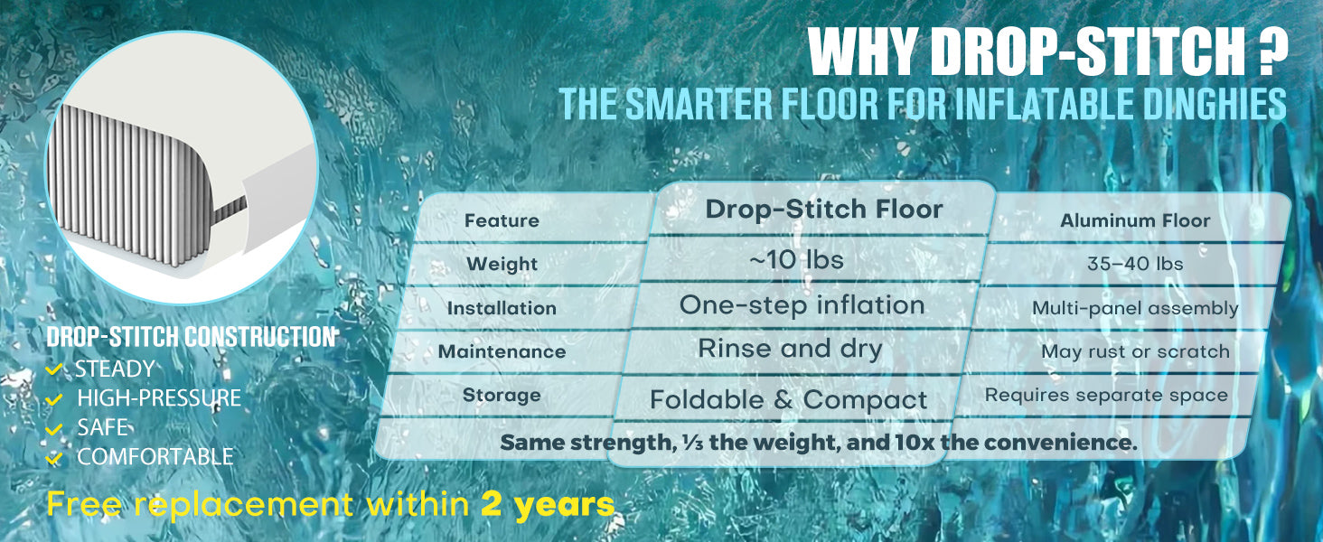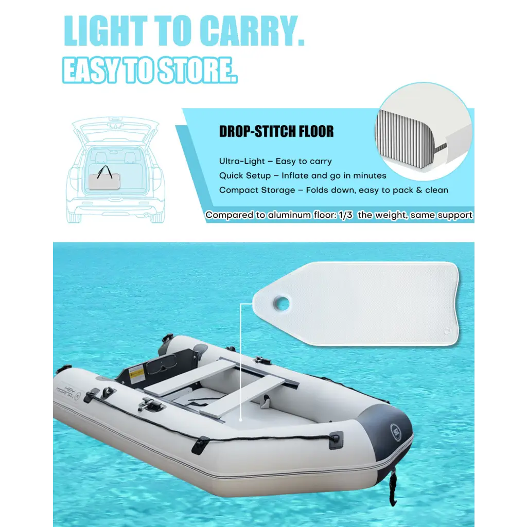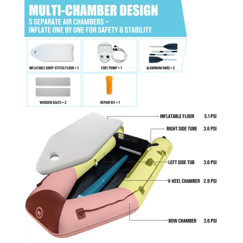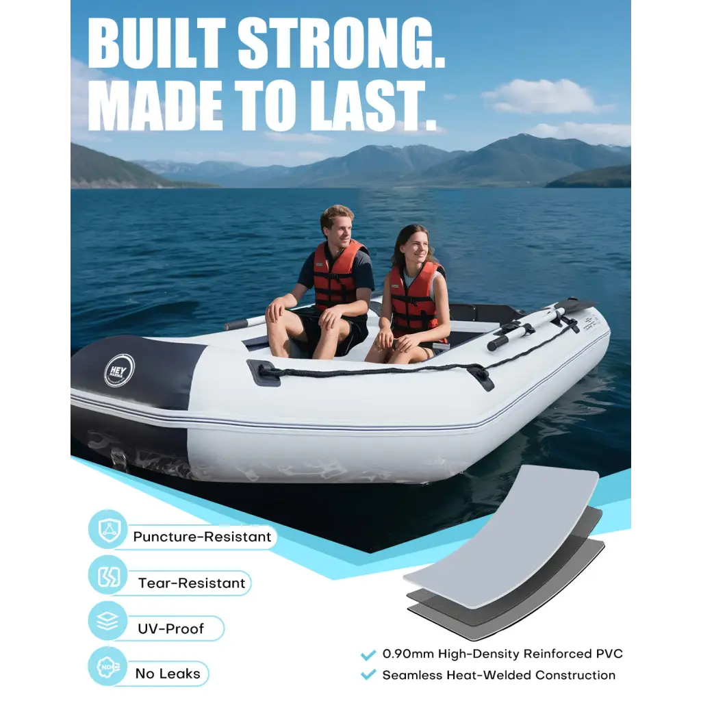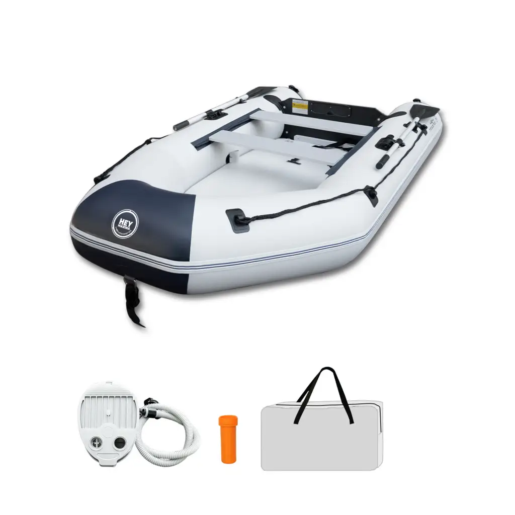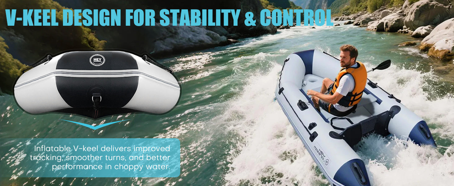 Safe and Stable: Stability is a key feature of our 10ft Heymarina series inflatable boat, thanks to its durable side tubes and sturdy keel. The side tubes are inflated to an optimal pressure of 0.25 bar/3.6 PSI, providing excellent buoyancy and side stability even in choppy waters. The keel, inflated to 0.2 bar/2.9 PSI, helps maintain directional control and balance, enhancing overall safety during operation. Whether used for outdoor adventures, competitive water sports, or leisurely rowing, this inflatable dinghy is engineered to keep you safe and secure, inspiring confidence in each activity undertaken on the water.