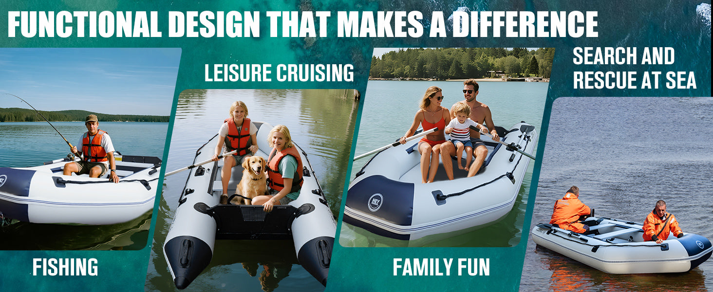Durable and Reliable: Our inflatable boat is crafted using high-strength, premium materials designed to withstand the rigors of various water conditions. This ensures exceptional durability and long-lasting performance, making the inflatable dinghy a dependable choice for both casual leisure outings and more challenging environments. Built to accommodate the needs of both adults and children, it offers a versatile solution for family adventures, fishing trips, or leisure excursions on lakes, rivers, or calm coastal waters. Its robust construction guarantees that you can rely on this inflatable boat to perform reliably year after year, providing peace of mind during your water activities.