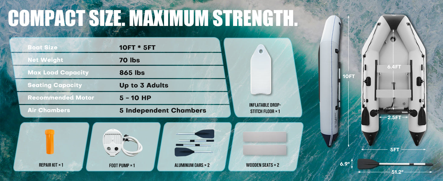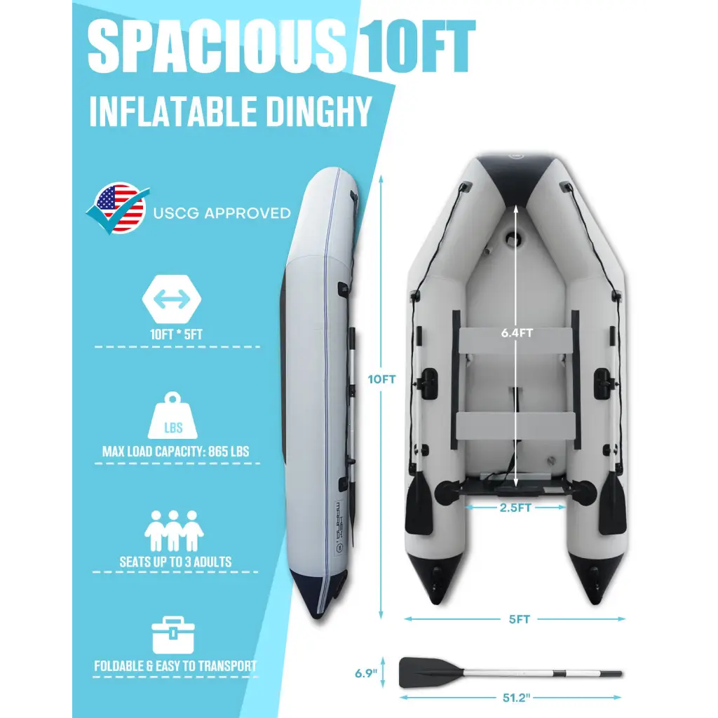 Spacious and Comfortable: Measuring 10ft x 5ft, our inflatable dinghy provides ample space for passengers to sit comfortably and move freely. The maximum load capacity of 3 persons or 865 lbs ensures that families, anglers, or water sports enthusiasts can enjoy their time on the water without feeling cramped. The interior dimensions—6.4ft/195cm in length and 2.5ft/76cm in width—offer generous room for movement, making it suitable for a variety of uses such as sailing, fishing, or simply relaxing on the water. Thoughtful design considerations ensure a stable and comfortable experience, whether you're paddling along a tranquil lake or drifting during a leisurely outing.