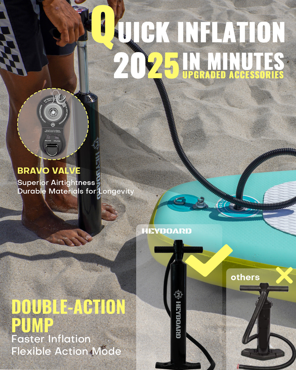 - CONSTRUCTION ULTRA-DURABLE ET LÉGÈRE – La planche de paddle HEYBOARD est fabriquée en matériau militaire Drop Stitch. La valve brevetée exclusive empêchera toute fuite d'air pendant cinq ans. Les rails latéraux à double couche rendent le HEYBOARD beaucoup plus solide et plus durable.