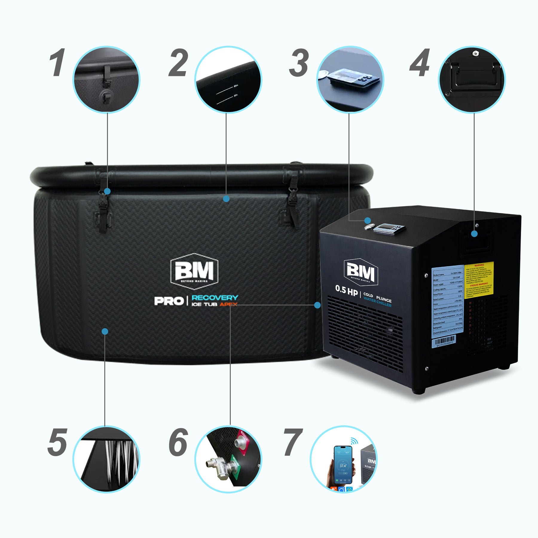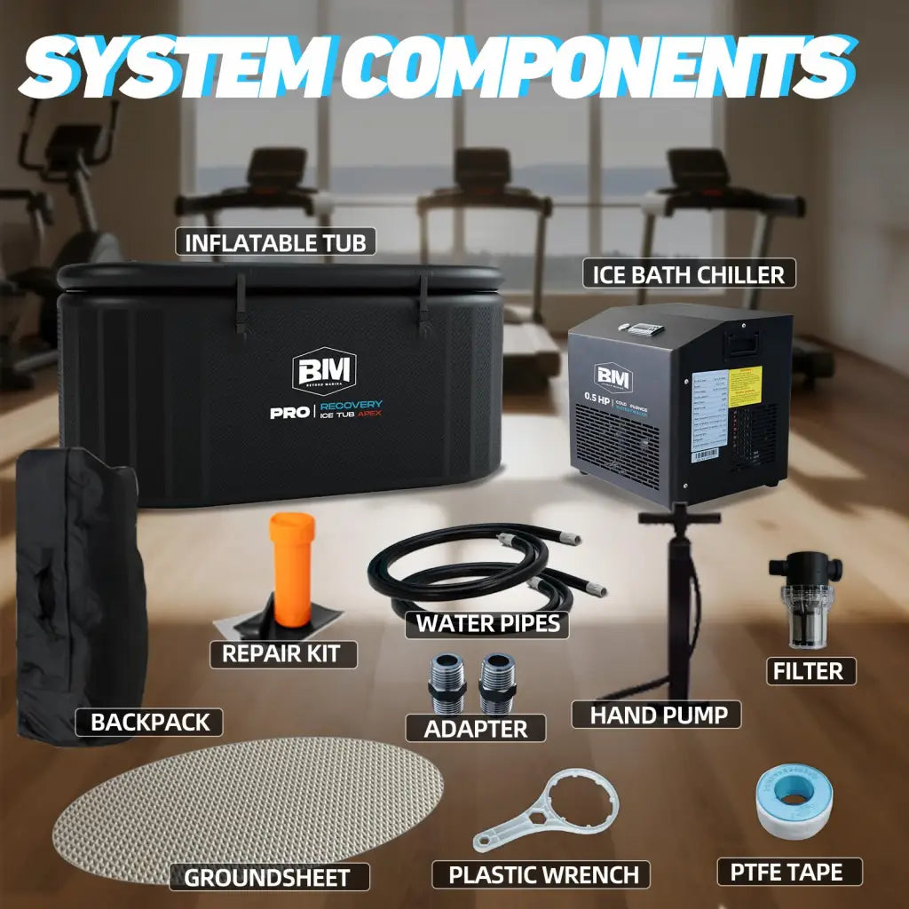 • セットアップ&リカバリーサポートキット:このパッケージには、高圧ポンプ、グランドシート、そして冷却器用の包括的なアクセサリーキット(水道管、PTFEテープ、シール、レンチ、コネクタ、詳細なマニュアル)が含まれています。この思慮深いセットはセットアッププロセスを簡素化し、長期的な機能性を確保することで、楕円形のアイスバスと冷却器システムを迅速に組み立てることができます。運動後のリカバリー、日々の健康管理、ストレス解消など、どのような用途でも、この包括的なシステムは、健康目標の達成をサポートし、継続的な冷却療法セッションを維持するための便利で効果的なソリューションを提供します。