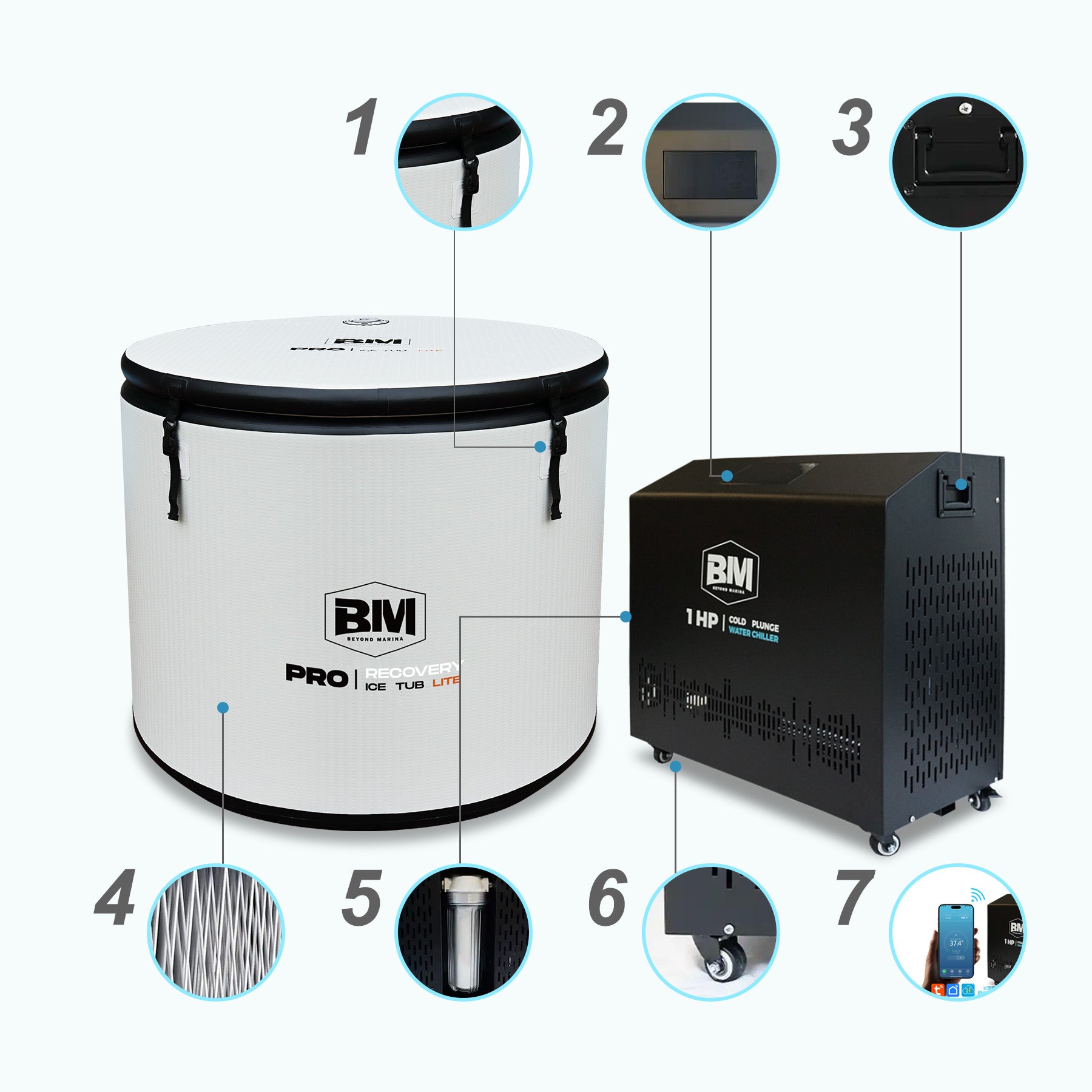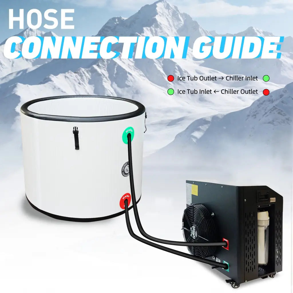 The chiller works with most standard ice bath tubs, including inflatable and portable models, thanks to its universal fittings and hoses. For best results, it’s recommended to pair it with tubs up to 115 gallons (435 liters), matching the capacity of the Beyond Marina Ice Tub. This ensures optimal cooling and heating efficiency.