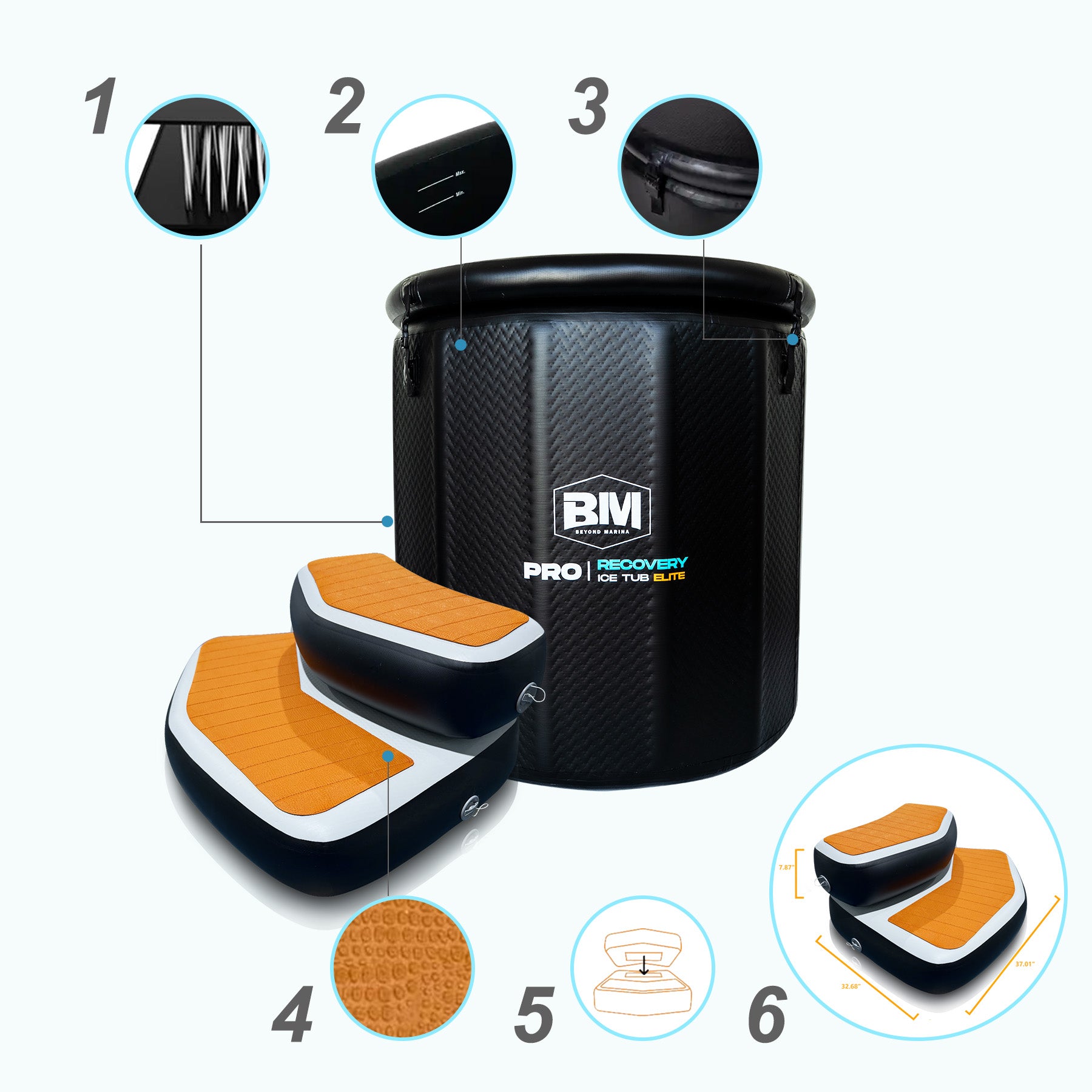 1. Premium Drop Stitch Material — Both the ice tub and step use premium drop-stitch material. They stay rigid yet lightweight, highly puncture-resistant and extremely durable.