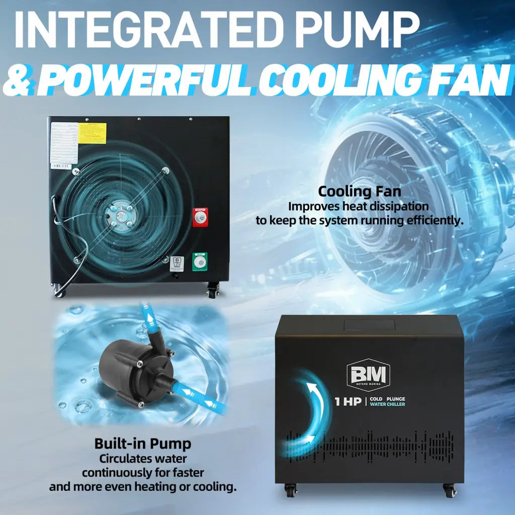 The 1HP Ice Bath Chiller features both cooling (2405W capacity) and heating (3600W capacity) capabilities, allowing you to customize your water temperature for either a refreshing cold plunge or a soothing warm soak. This versatility enhances recovery flexibility for athletes and wellness enthusiasts.