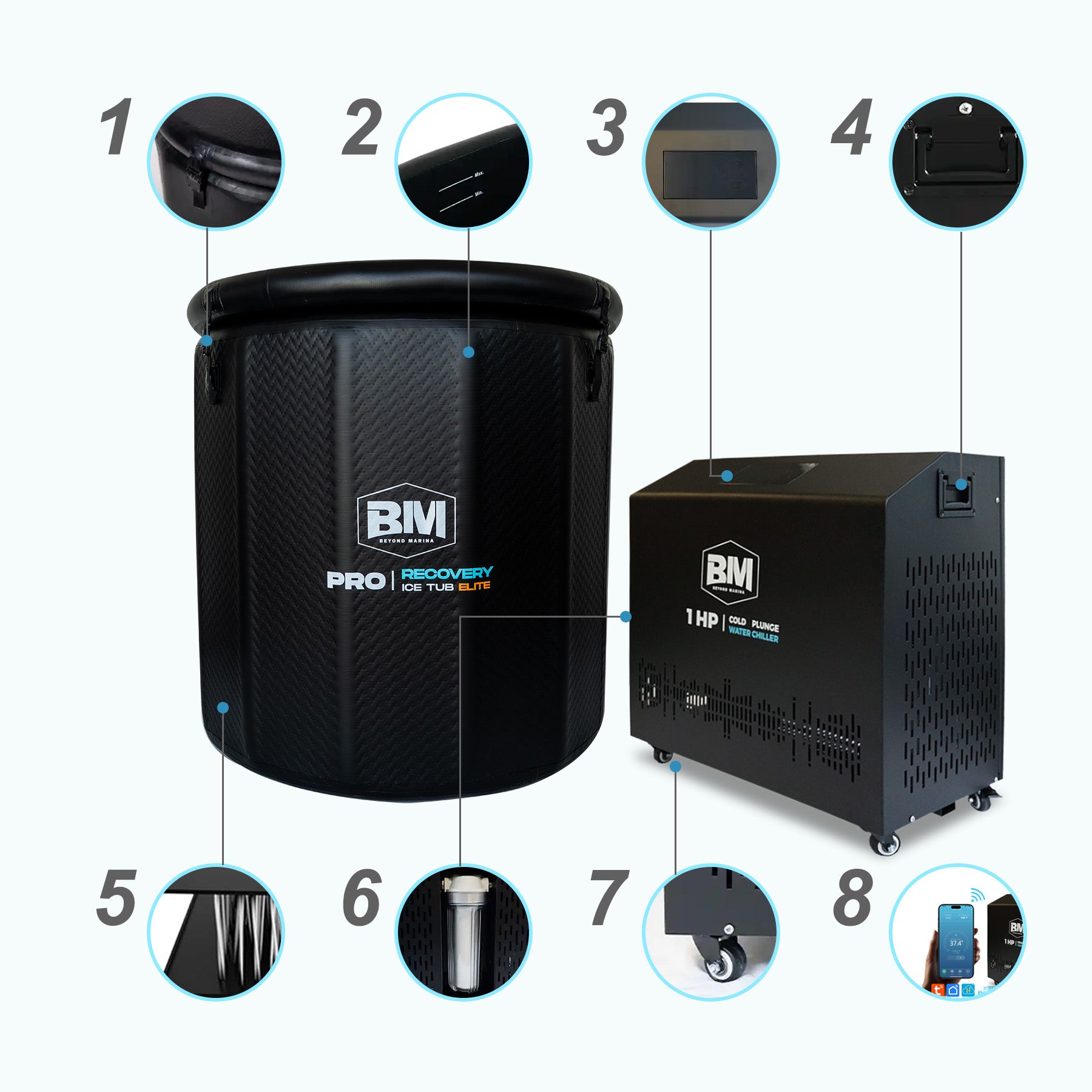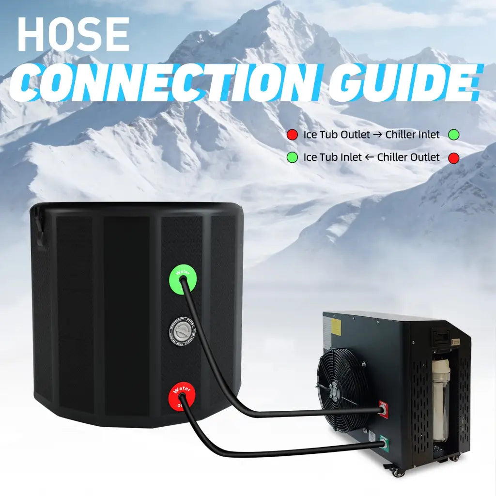The chiller works with most standard ice bath tubs, including inflatable and portable models, thanks to its universal fittings and hoses. For best results, it’s recommended to pair it with tubs up to 115 gallons (435 liters), matching the capacity of the Beyond Marina Ice Tub. This ensures optimal cooling and heating efficiency.
