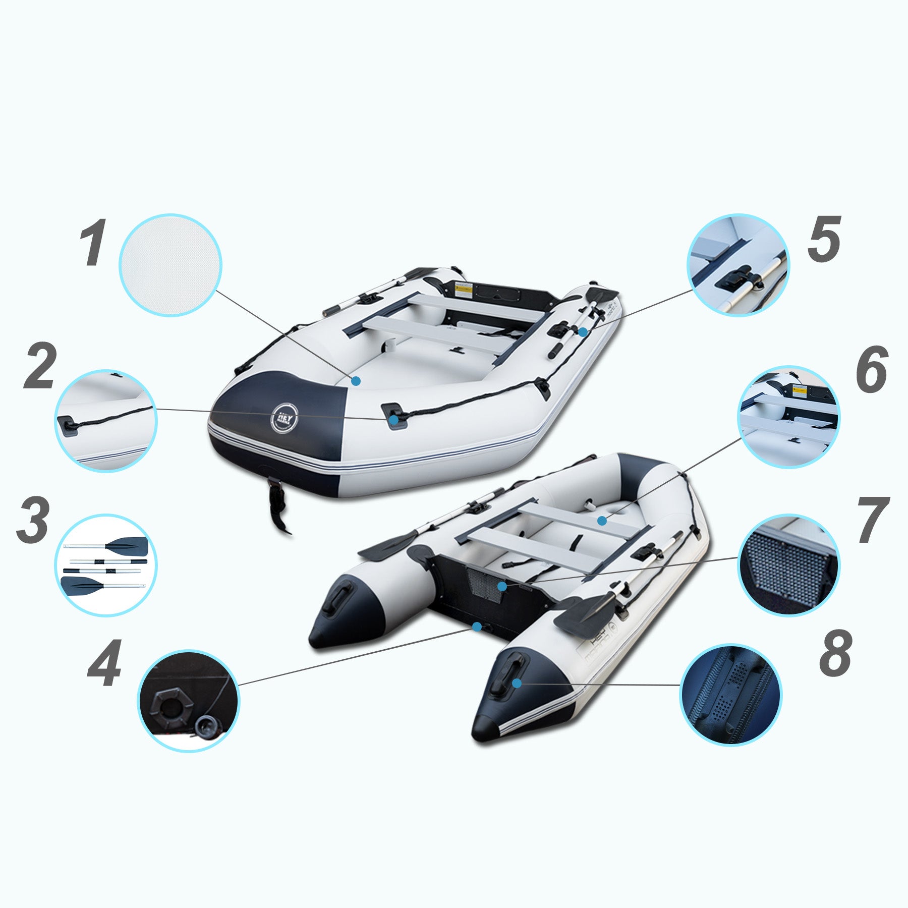 Safe and Stable: Stability is a key feature of our 10ft Heymarina series inflatable boat, thanks to its durable side tubes and sturdy keel. The side tubes are inflated to an optimal pressure of 0.25 bar/3.6 PSI, providing excellent buoyancy and side stability even in choppy waters. The keel, inflated to 0.2 bar/2.9 PSI, helps maintain directional control and balance, enhancing overall safety during operation. Whether used for outdoor adventures, competitive water sports, or leisurely rowing, this inflatable dinghy is engineered to keep you safe and secure, inspiring confidence in each activity undertaken on the water.