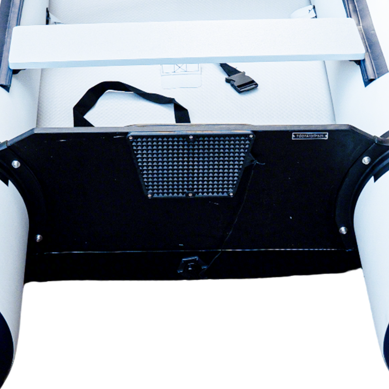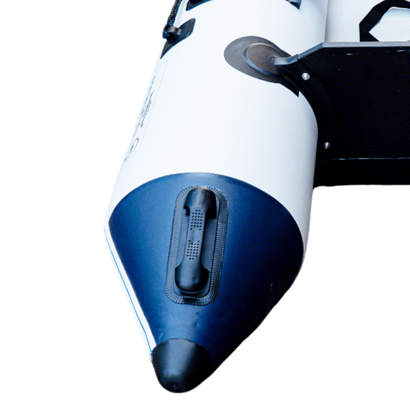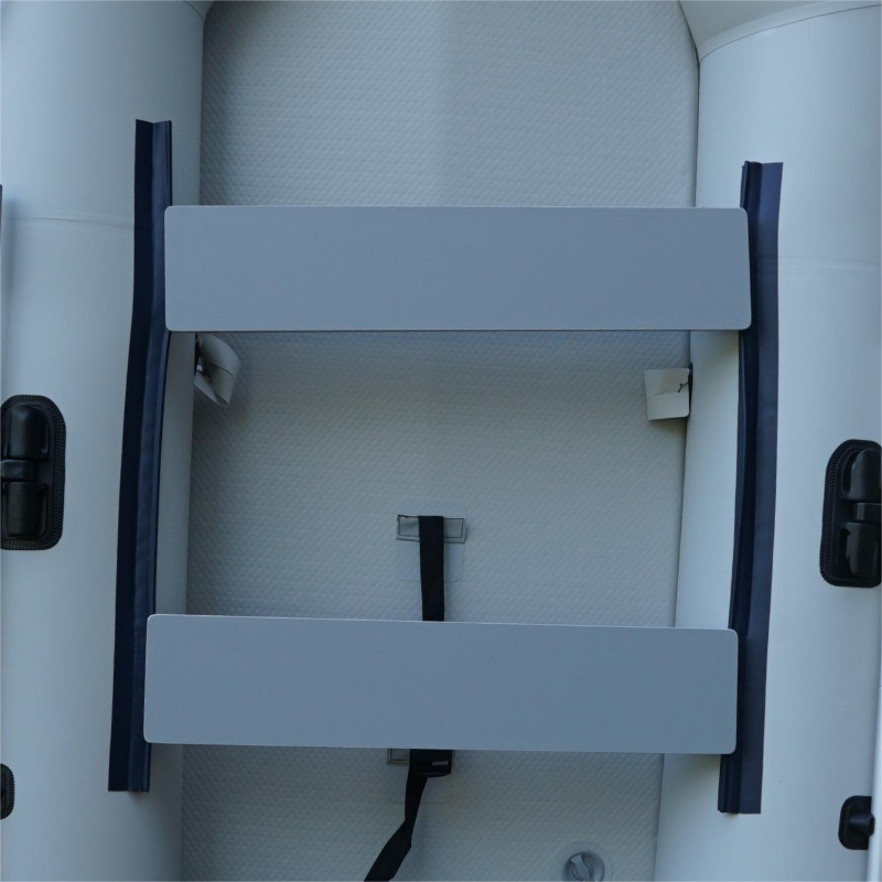 The inflatable dinghy boat features a high-pressure drop-stitch floor, offering excellent rigidity while remaining lightweight and portable for easy transport and storage.