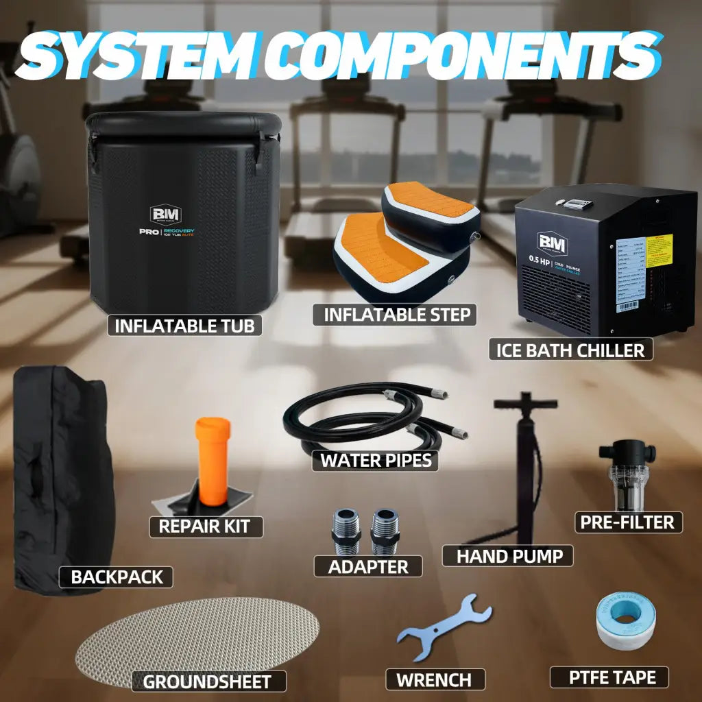 - Complete Setup & Recovery Support Kit: The package includes a high-pressure pump, a protective ground sheet, and a comprehensive accessory kit featuring water pipes, PTFE tape, seals, a wrench, connectors, and an instructional manual. This thoughtful collection ensures easy assembly and ongoing maintenance, helping you get started quickly and keep your inflatable cold plunge tub in optimal condition. Whether for post-exercise recovery or daily wellness, this system supports a seamless experience that promotes health, relaxation, and rejuvenation.