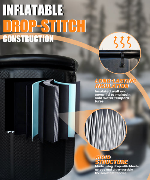 Fully Insulated & Built to Last: Constructed with military-grade double-layer material and drop-stitch insulation, the tub effectively maintains colder temperatures longer—whether filled with ice or connected to a chiller. The thermal lid enhances insulation, while the puncture-resistant, UV-resistant, and leak-proof build ensures durability through repeated use and folds