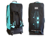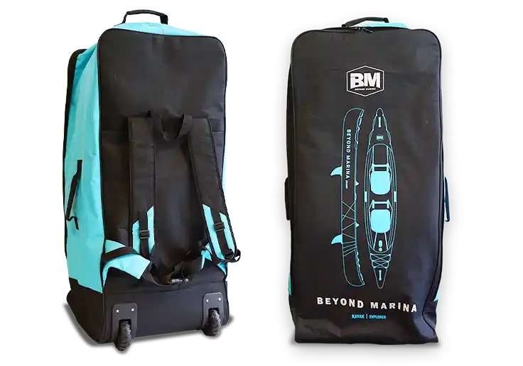 The wheeled bag is designed for easy transport and storage. Featuring a durable black and teal design with the Beyond Marina logo, it offers ample space to hold the deflated kayak, paddles, and accessories. The sturdy wheels and retractable handle allow effortless mobility, while the padded shoulder straps provide a backpack option for hands-free carrying. Its rugged material ensures protection against wear, making it ideal for kayakers on the go, whether heading to the lake or storing at home.