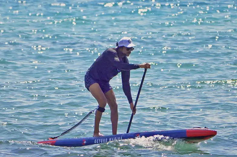 Racing SUP boards are designed for speed, which often means they are narrower than all-around boards, potentially affecting stability. The Beyond Marina RACE 12'6" and 14' boards feature a sleek shape with a tapered tail to enhance glide and maneuverability, making them ideal for experienced racers. However, this design might feel less stable for beginners. The boards include an EVA standing tray and a diamond-textured deck, providing excellent grip to help maintain balance during high-speed paddling.